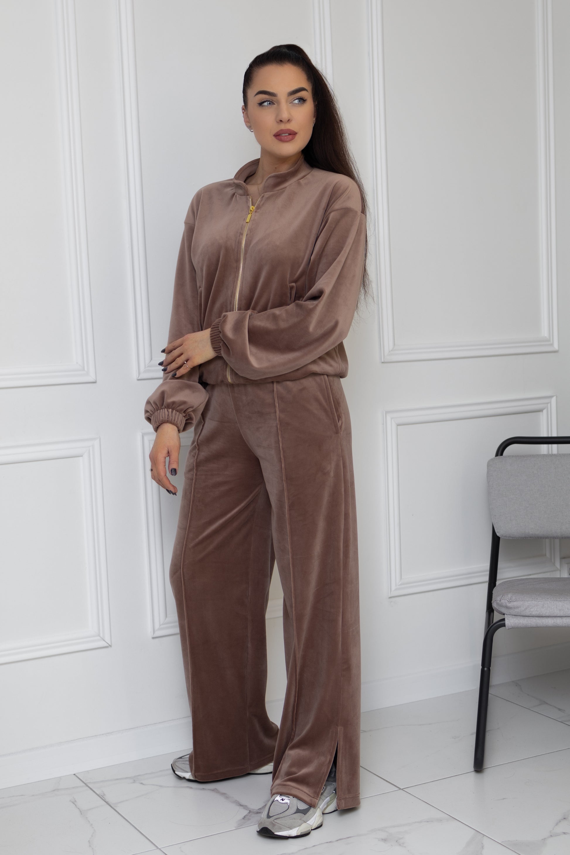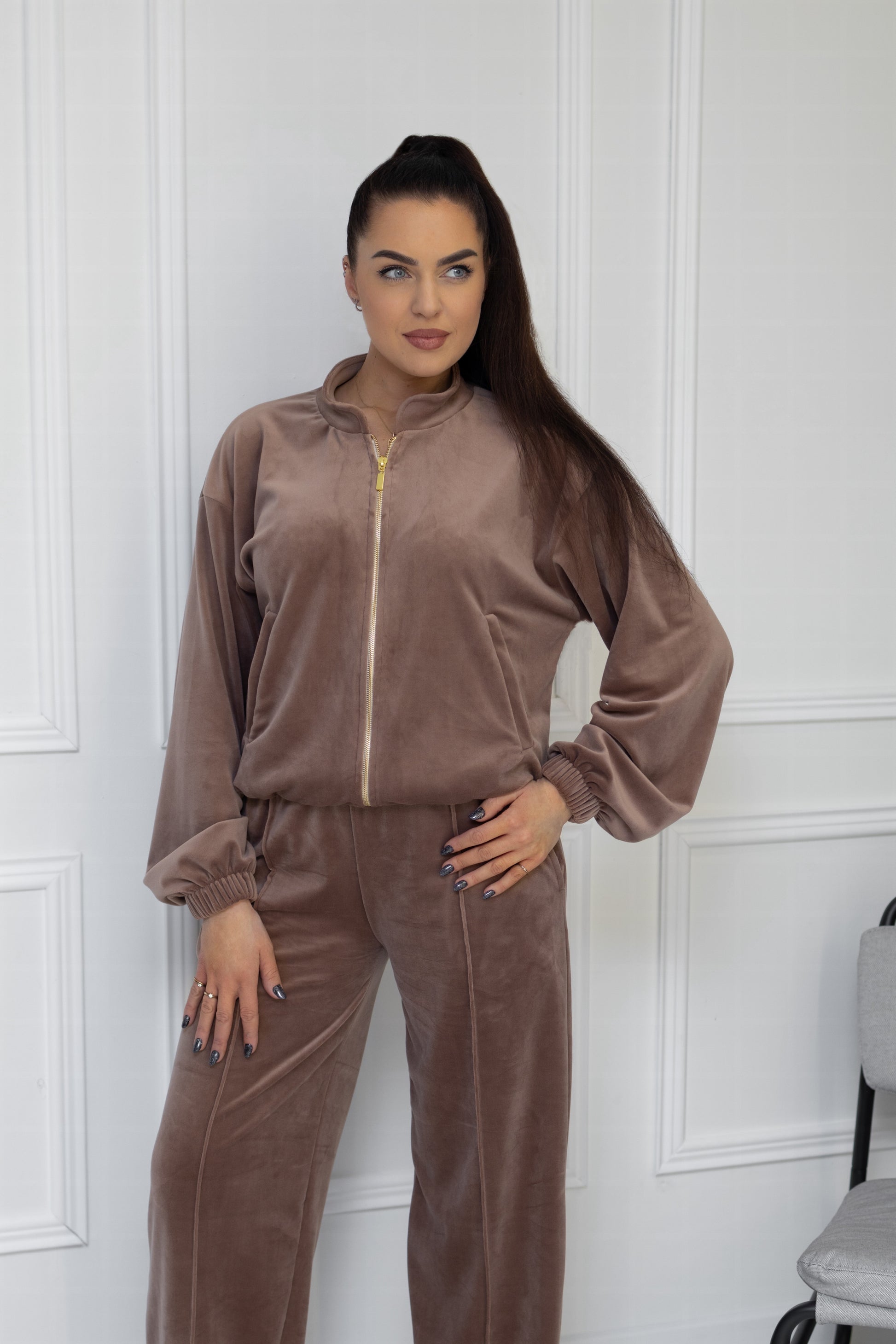 Stylish and elegant high-quality soft velour leisure suit. The soft fabric provides a feeling of softness and comfort, does not restrict movement, and is comfortable to wear. The set includes a sweater and trousers.