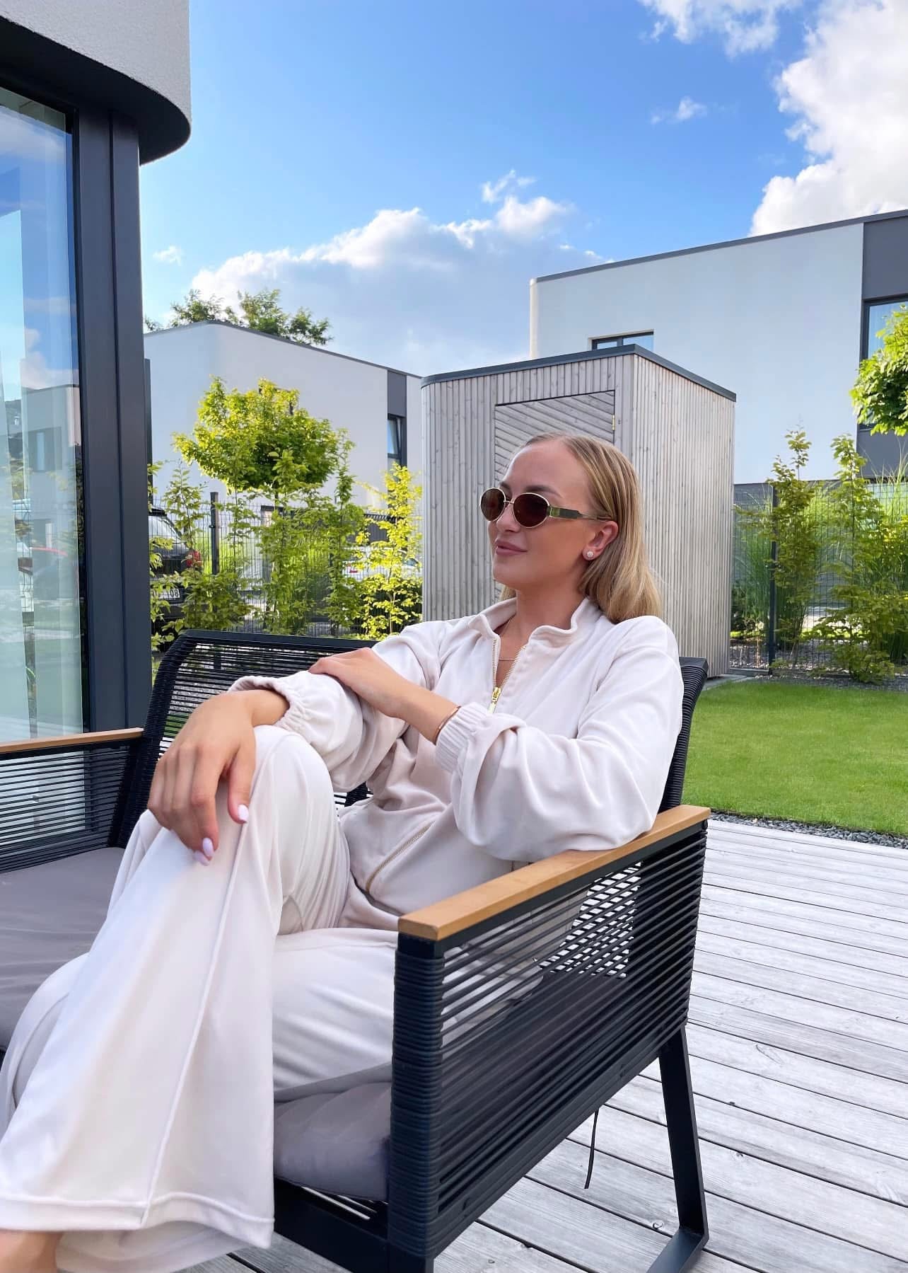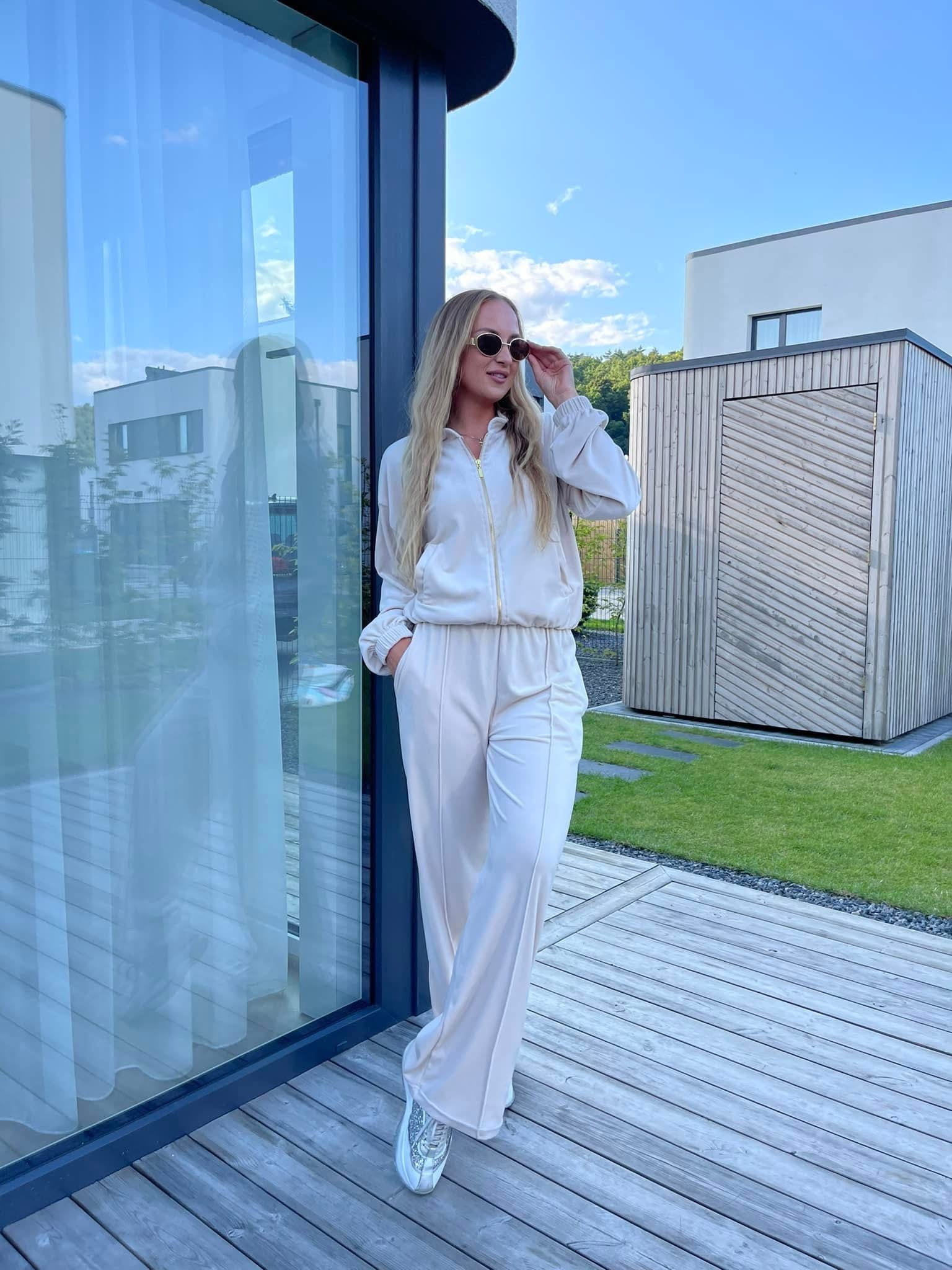 The wide cut of the trousers and the practical jacket with pockets give a sense of freedom, perfect for both home and active leisure.