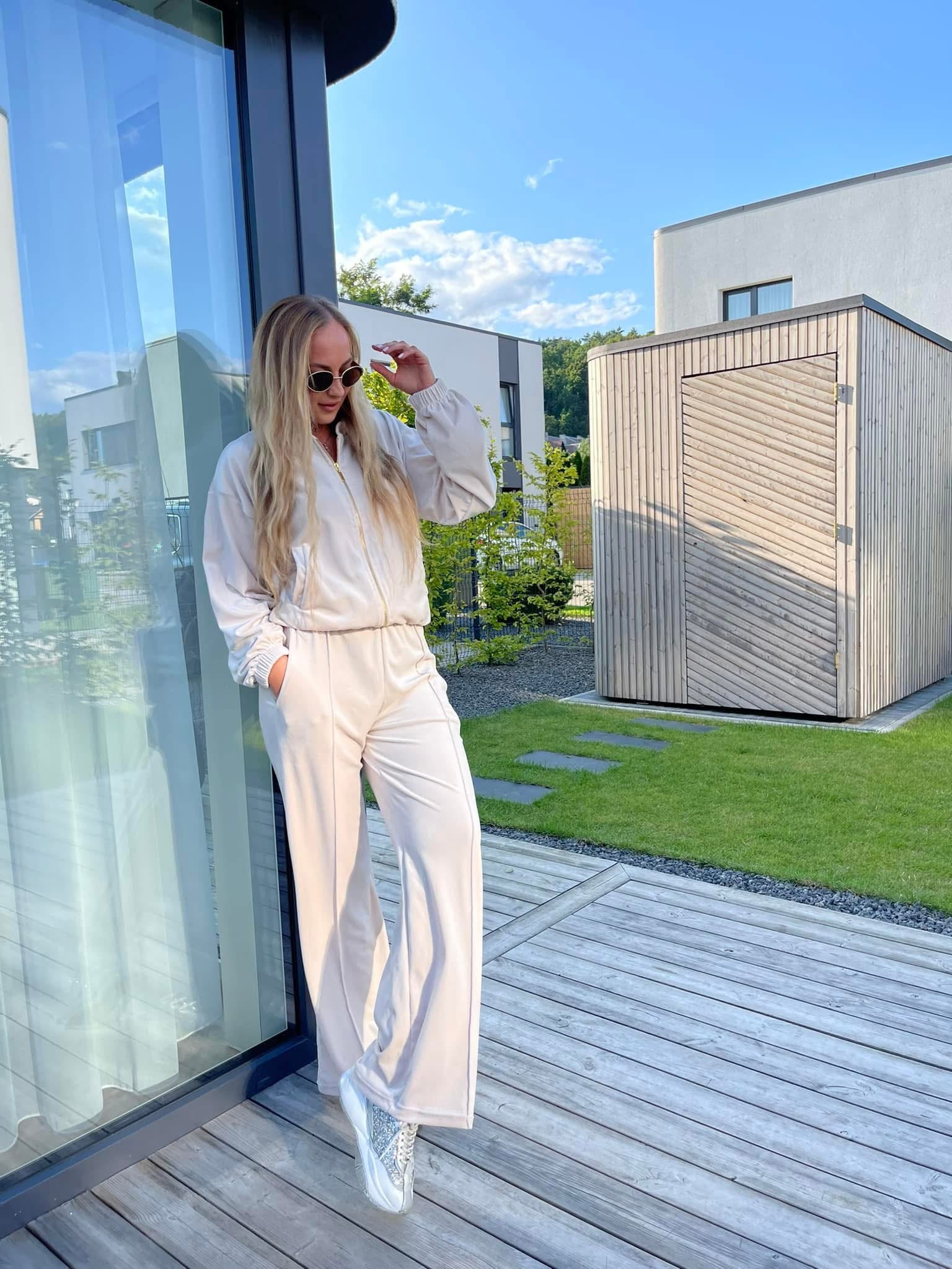 Stylish and elegant high-quality soft velour leisure suit. The soft fabric provides a feeling of softness and comfort, does not restrict movement, and is comfortable to wear. The set includes a sweater and trousers.