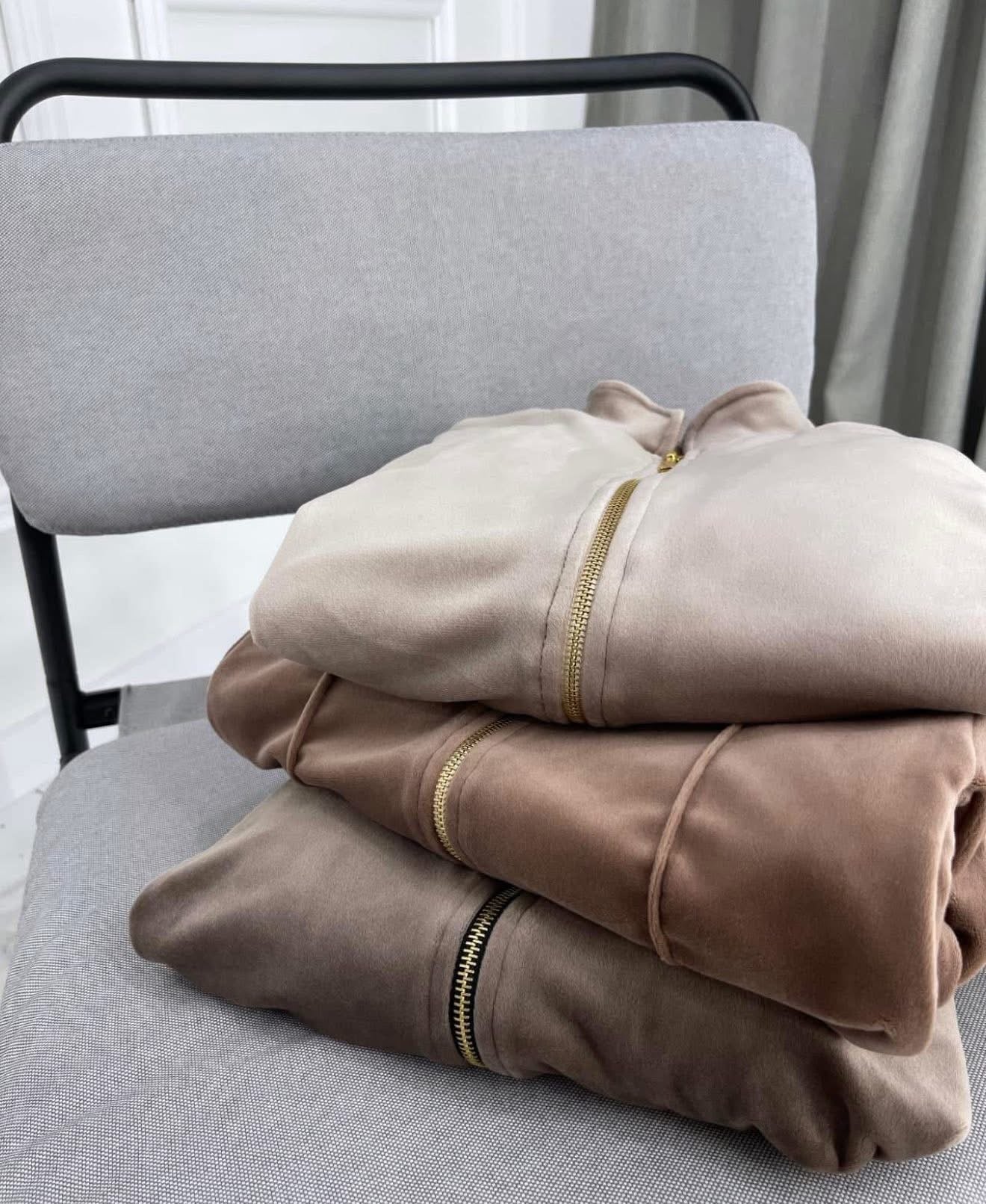 Stilingas ir elegantiškas aukštos kokybės soft veliūro laisvalaikio kostiumas. Minkštas audinys suteikia švelnumo ir komforto jausmą, nevaržo judesių, yra patogus dėvėti. Komplektą sudaro džemperis ir kelnės.